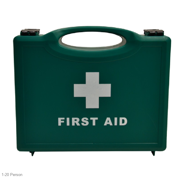 The Essential first aid kit is supplied in a hard-wearing green box for high visibility and durability, with double clip opening for ensured easy access in an emergency situation. The kit is suitable for up to 20 persons and includes: 1 x guidance leaflet, 40 x assorted plasters, 4 x eye pads, 6 x triangular bandages (with 2 safety pins each), 9 x medium dressings, 3 x large dressings, 2 x pairs of disposable gloves, and 1 x 10 pack of moist wipes.