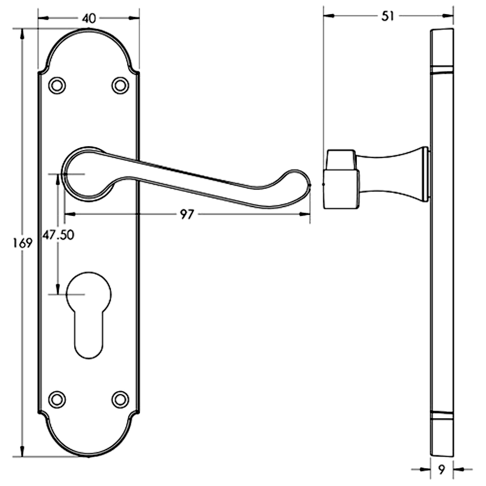 The Epsom range of plate handle furniture is designed to suit all types of residential interior doors and is manufactured from zinc. These sprung handles are set on a 169mm x 40mm backplate and this version is a lever/lever euro design.