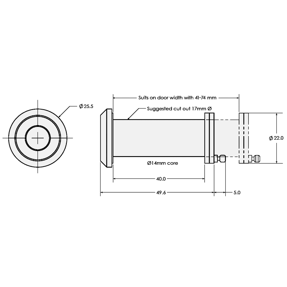 This Rutland door viewer is a high-performance, fire and security rated privacy solution designed for use in front entrance and fire door applications. It is built to meet the stringent requirements of the DHF TS002:2009 standard for door viewers, including fire resistance (BS EN 1634-1) and smoke resistance (BS EN 1634-3); and includes a pre-applied intumescent sleeve. The wide-angle vision of 140° and telescopic adjustment make it able to accommodate door thicknesses from 41 mm to 74 mm and versatile enough for a wide range of timber and metal door installations.