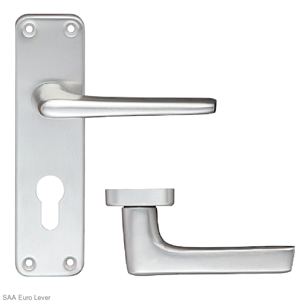 Zoo Architectural aluminium lever backplate furniture to suit euro cylinder locks. Sold as a pair this contract handle set has a satin anodised aluminium finish and a 90mm long handle.